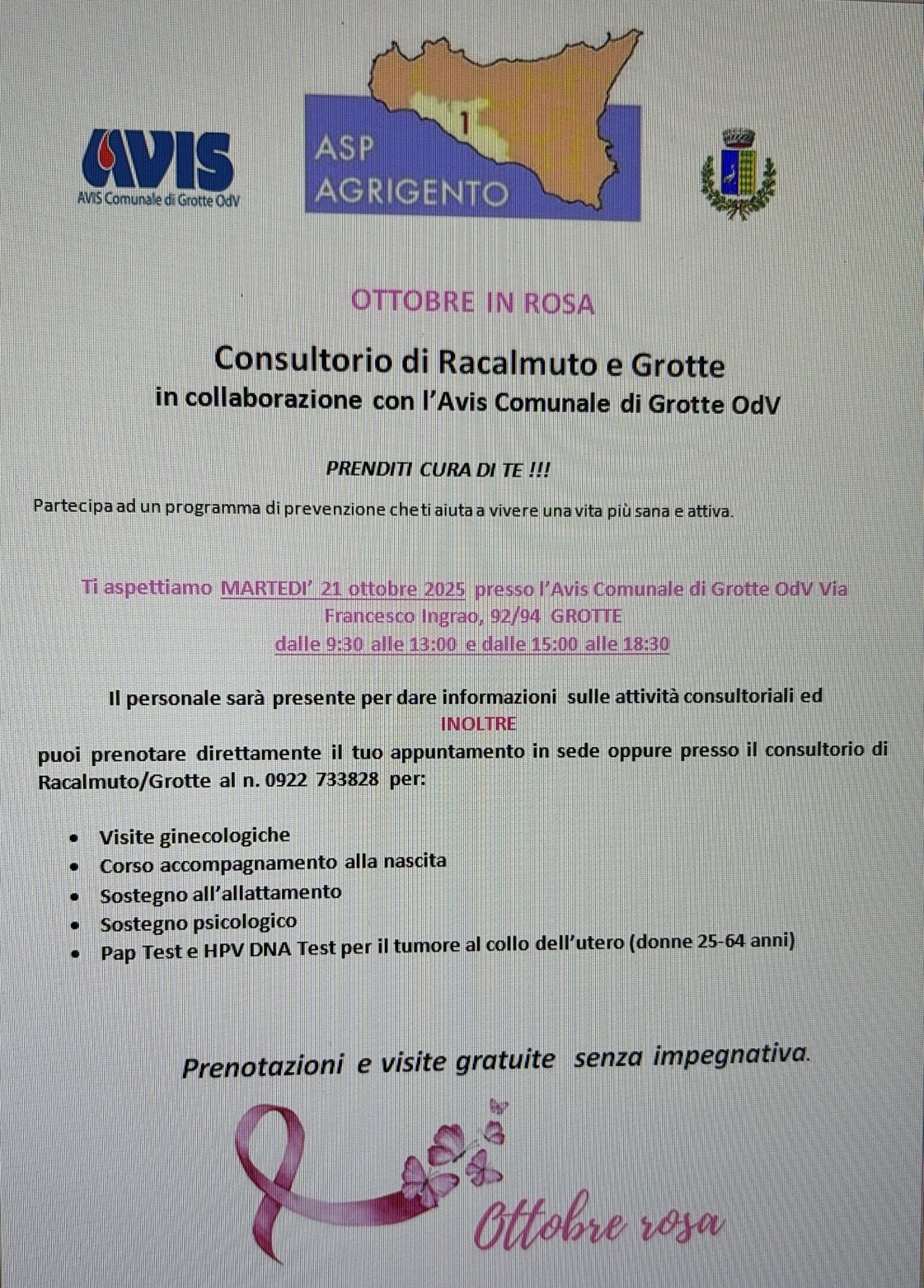 “Ottobre in Rosa” non è solo uno slogan, ma un invito concreto a prendersi cura della propria salute. Martedì 21 ottobre 2025, l’AVIS Comunale di Grotte OdV ospiterà un’importante iniziativa di prevenzione, realizzata dal Consultorio di Racalmuto e Grotte e il patrocinio del Comune di Grotte.